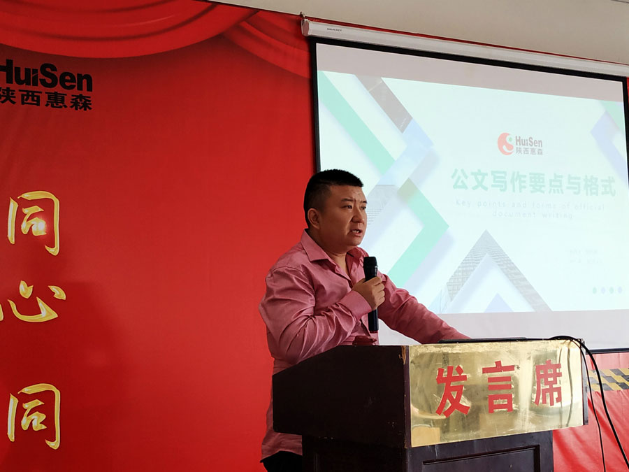 培训会伊始,刘京翰董事长以集团公司【2020】14号文件中十六字方针“服务、指导、管理、考核”、“开拓、研究、创新、创收”为出发点,指出了公文写作与十六字方针之间的关系是息息相关的,强调了公文写作与应用的重要性,要求惠森公司全员高度重视公文写作,起草公司公文前先列提纲,行文要主题突出、目的明确、简洁明了、表达准确、通俗易懂、格式规范等,必须熟练掌握拟文要领与写作方法,不断提高自身写作能力和工作效率。