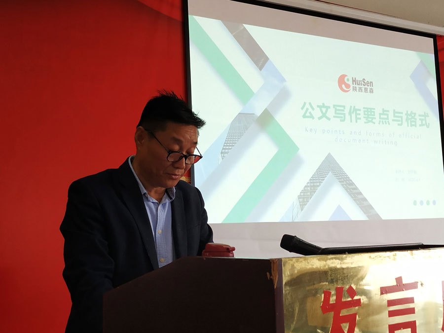 授课中董事长以PPT形式深入浅出地介绍各类文书写作的基础知识,阐述了法定公文与事务文书的分类、规范格式。着重结合集团公司业务和实际案例,向全体人员剖析关于请示、报告、工作总结、通知、通报、会议纪要等常用公文的写作方法及正误对比。整个授课过程中,大家专心听讲,认真做笔记,不时地用手机拍摄PPT内容。