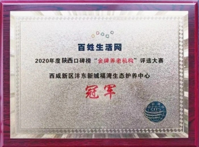 福湾康养严格按照上级规定做好疫情防控工作,面对极大的成本费用压力,坚持做好老人入住的全面服务,受各界好评,且二期项目顺利完工,在百姓生活网陕西口碑榜“金牌养老机构”评选大赛中荣获冠军称号。