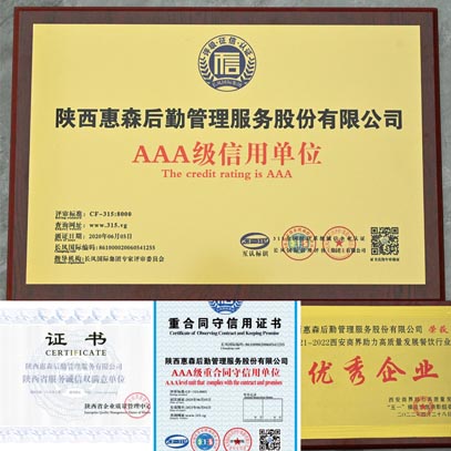 陕西惠森后勤管理服务股份有限公司创立于2003年,是一家集团餐、物业、安保、消防,养老、医疗、电商APP、大健康、社区服务、文化教育、职业培训、公益慈善为一体的的大型社会化后勤管理服务综合性企业。公司现有注册资本2000万元,员工2500余人,下辖行政综合部、财务管理部、人力资源部、安全运营部、市场开发部5个部门、3个子公司、20个保障区,有500余亩集养殖、种植为一体的后勤保障配送基地。