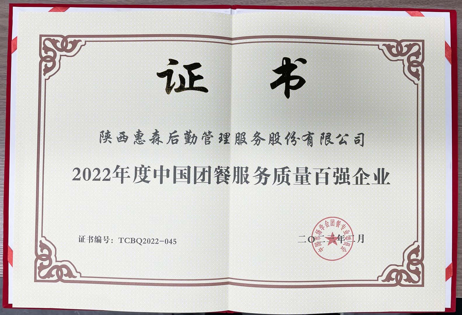 (2022年度中国团餐服务质量百强企业荣誉证书)