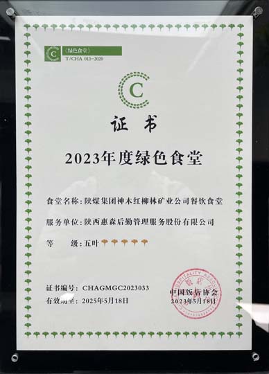 大会上,为了提升食堂的精细化管理水平,打造品质化、品牌化、智慧化、绿色化、节约化的高质量食堂,中国饭店协会依据《绿色食堂》(T/CHA 013—2020)团体标准,开展了2023年度绿色食堂的认定工作,经协会多方面综合评定,陕西惠森后勤管理服务股份有限公司服务的红柳林餐饮食堂荣获“2023年度绿色食堂”奖项。