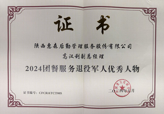 大会上,陕西惠森后勤管理服务股份有限公司凭借在团餐领域的杰出表现和持续创新,荣获“2024中国团餐服务百强企业”荣誉称号。同时,惠森公司副总经理高汉利因在推动退役军人就业方面的卓越贡献,被授予“团餐服务退役军人优秀人物”称号。这些荣誉不仅是对惠森公司过去一年努力与成就的高度认可,更是对其未来引领行业发展的深切期待。